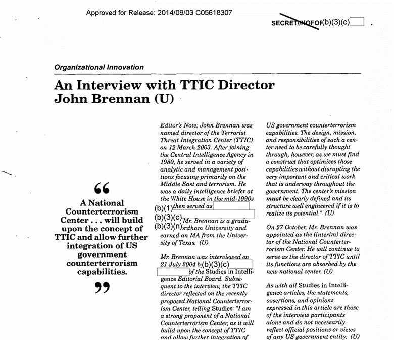 [3] “An interview with TTIC Director John Brennan”; Studies In Intelligence; Vol 48, No. 4, with Paul Johnson, Editor Studies in Intelligence, interview date July 21, 2004; https://www.cia.gov/library/readingroom/docs/DOC_0005618307.pdf