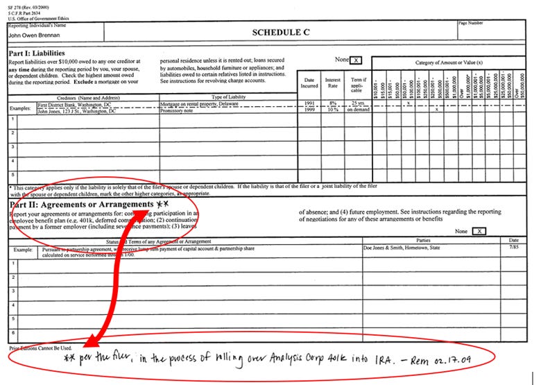 When Brennan joined the Obama Administration, he filed his first Executive Branch Personnel Financial Disclosure Form (SF-278) which clearly shows he owned a TAC 401K which he valued at $50,000. The Office of Government Ethics representative, Rachel Molinaro noted Brennan told her he was going to roll the TAC 401K into an IRA. Brennan’s subsequent Disclosure forms show he just changed the name of the TAC 401K to SOTERA 401K. SOTERA was the successor name of the TAC.