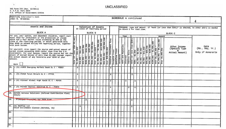 [25] John O. BRENNAN , Financial Disclosure Form 278e, dated 7/19/2016 “…BRENNAN financial disclosure Form 278e, Line 1 reveals he still has a 401K account with Sotera Defense Solutions, Inc., and indicated he had between $100,001 and $250,000 in this account and he claims it is an Excepted Investment Fund. Carrie Truehart, OGE, and Emory Rounds, OGE, certified the form is in compliance with the law…”