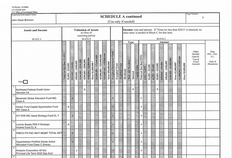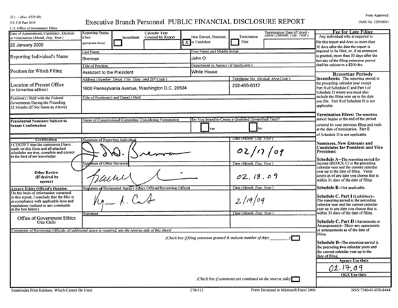 [8] John O. Brennan, Executive Branch Personal Financial Disclosure (SF-278); dated Feb 17, 2009; http://online.wsj.com/public/resources/documents/Brennan.pdf