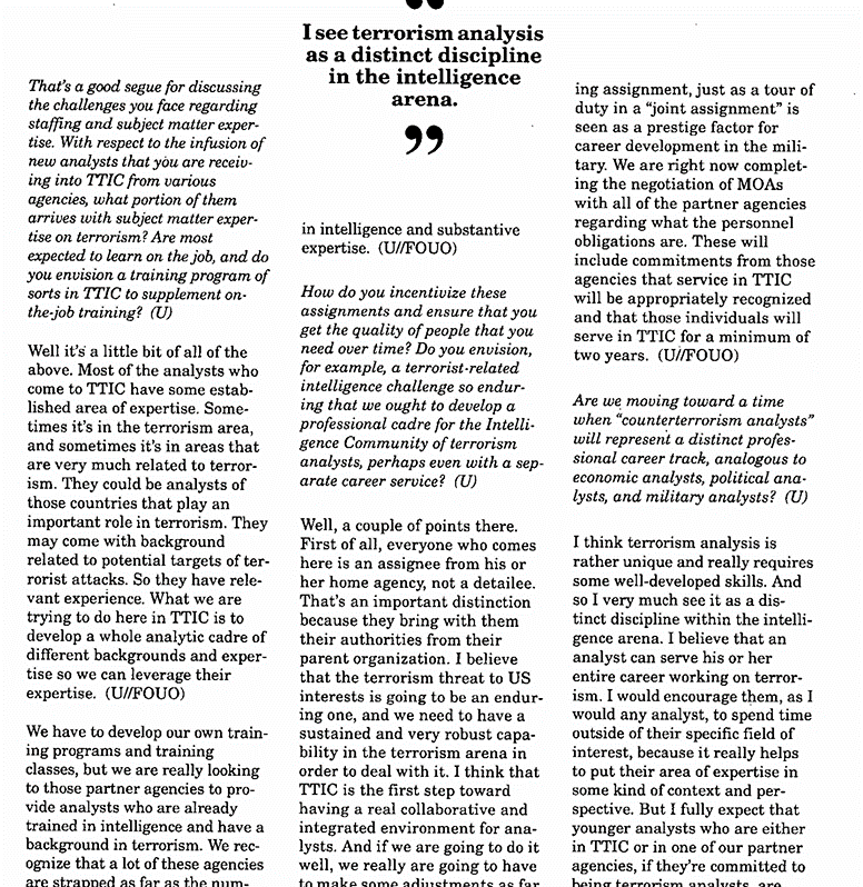 [2] “An interview with TTIC Director John Brennan”; Studies In Intelligence; Vol 48, No. 4, with Paul Johnson, Editor Studies in Intelligence, interview date July 21, 2004; https://www.cia.gov/library/readingroom/docs/DOC_0005618307.pdf